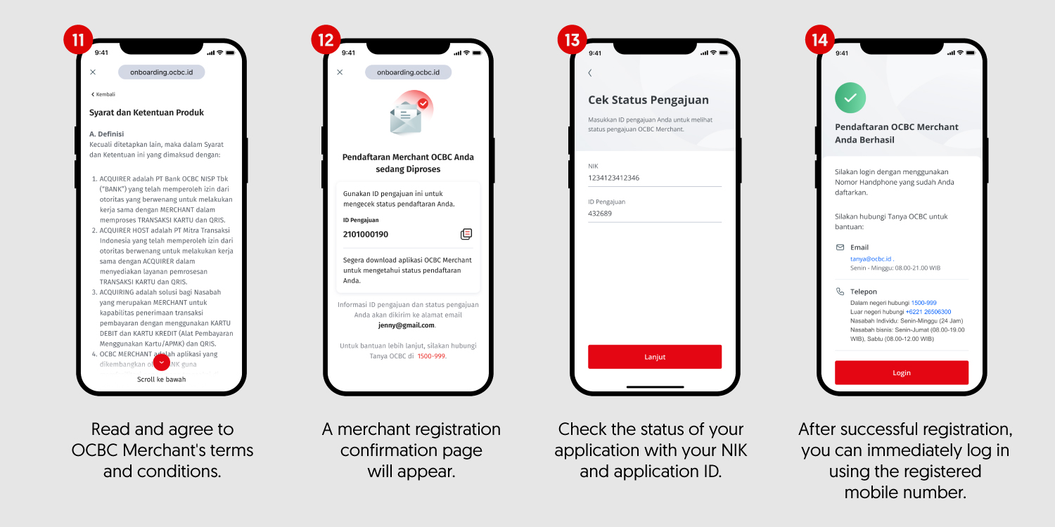 Once you have completed the registration, OCBC Merchant will provide an Application ID through the application and email. You can check the application status in the OCBC Merchant app by entering the Application ID and NIK used during registration.