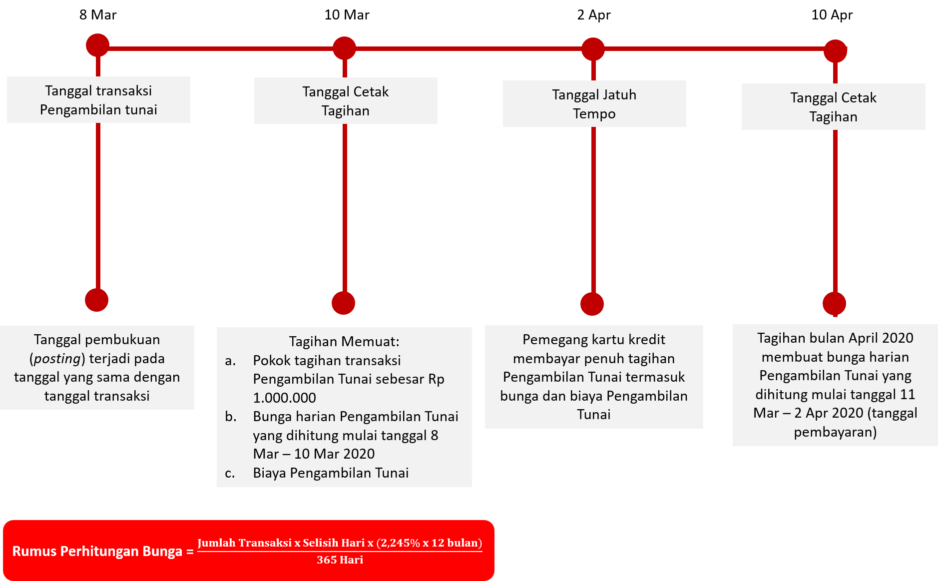 Interest will be charged if the Cardholder pays less than the total new bill, or pays after the Due Date. Interest for Shopping Transactions is calculated based on the Posting Date (Posting Date) of the transactions made. The interest rates that apply to purchase transactions are listed on the Billing Sheet. Unpaid costs, penalties, or interest are not included in the interest calculation component. Interest will be charged on the next billing sheet. For a complete interest calculation can be seen in the illustration of credit card interest calculations.